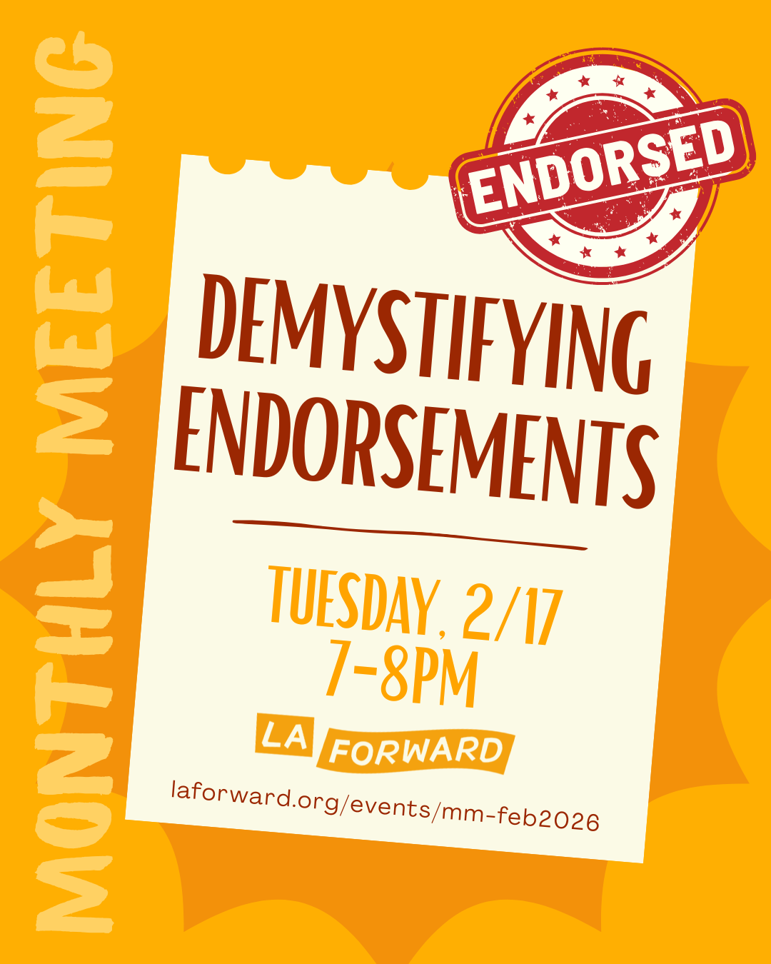 Join us for our Monthly Meeting as we break down what endorsements actually mean and how these decisions are made. We’ll be joined by a special guest, Danielle Cendejas, who is an experienced political consultant, a Partner at The Strategy Group, and a former board member of LA Forward Institute.